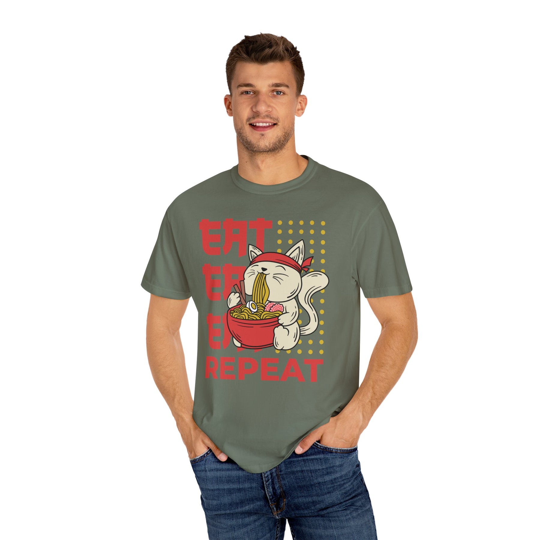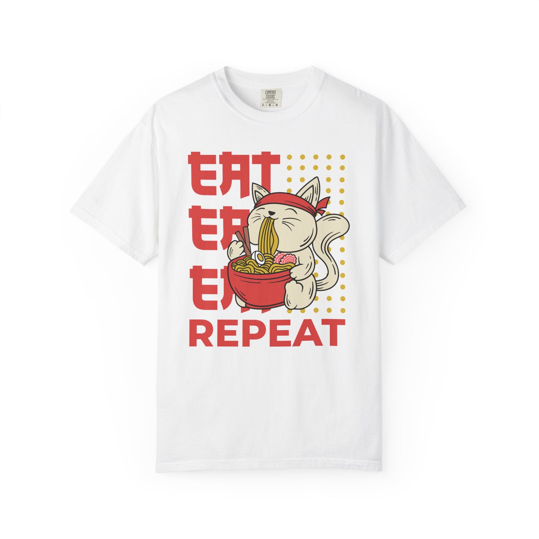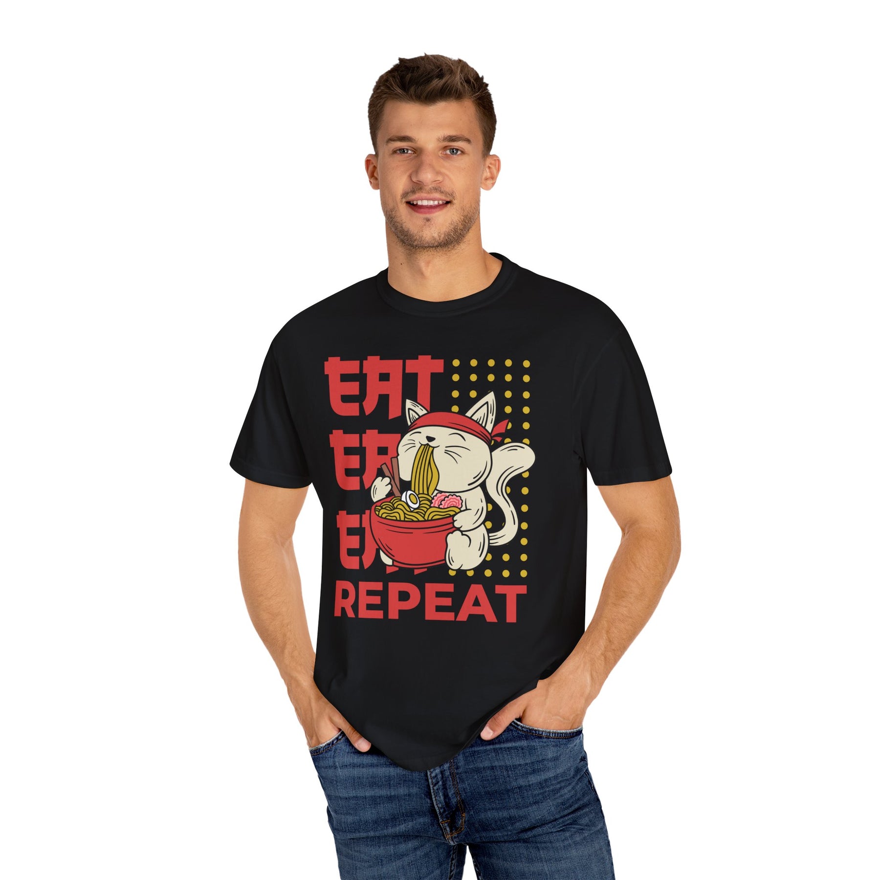 The design captures a whimsical moment of a cat eating ramen, making it an instant conversation starter. This graphic ramen tee is ideal for foodies and anime fans alike. It’s a great way to express your passion, whether you're at a convention, a local noodle bar, or just hanging out with friends. This neko ramen shirt perfectly blends humor and style.
